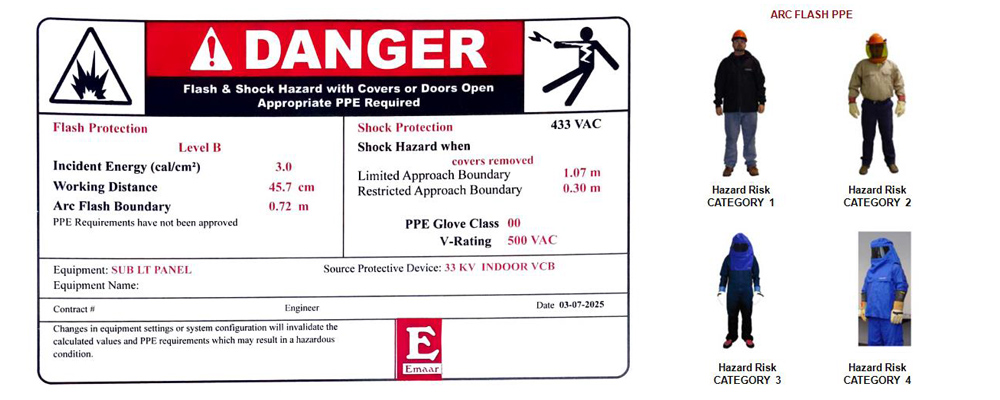 - Arc Flash Labeling – Displaying arc flash boundary, PPE category, and incident energy level on panels.
